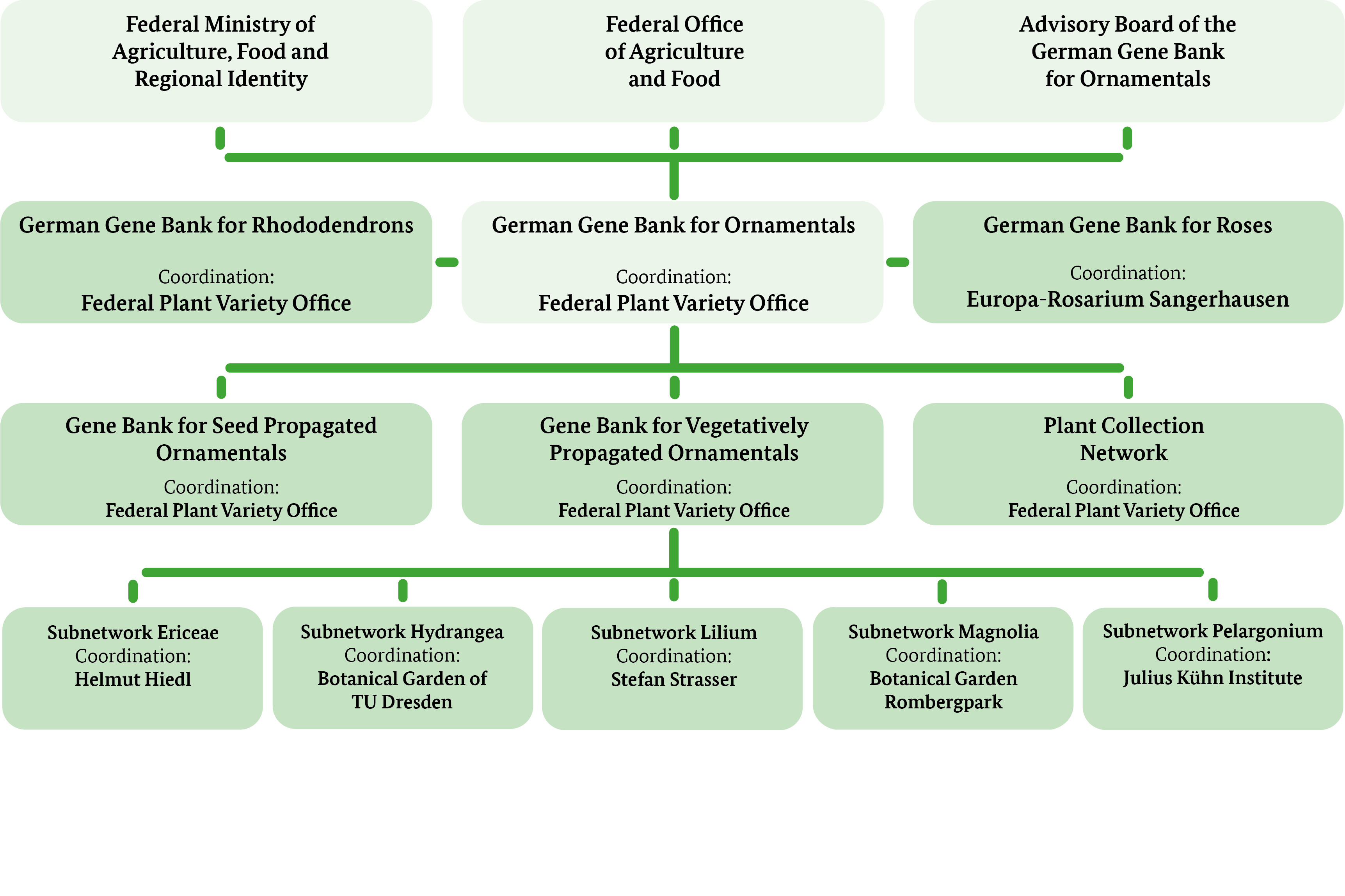 Each gene bank consists of a coordination centre, collection-holding and supporting partners, as well as the BSA and the BLE (DGZ Organisation chart). The collection-holding partners provide material material for the gene banks, while supporting partners are important contributors thanks to their expertise. All gene banks and subnetworks operate under the common DGZ logo. Scientific advice is provided by the advisory board of the German Gene Bank for Ornamentals.