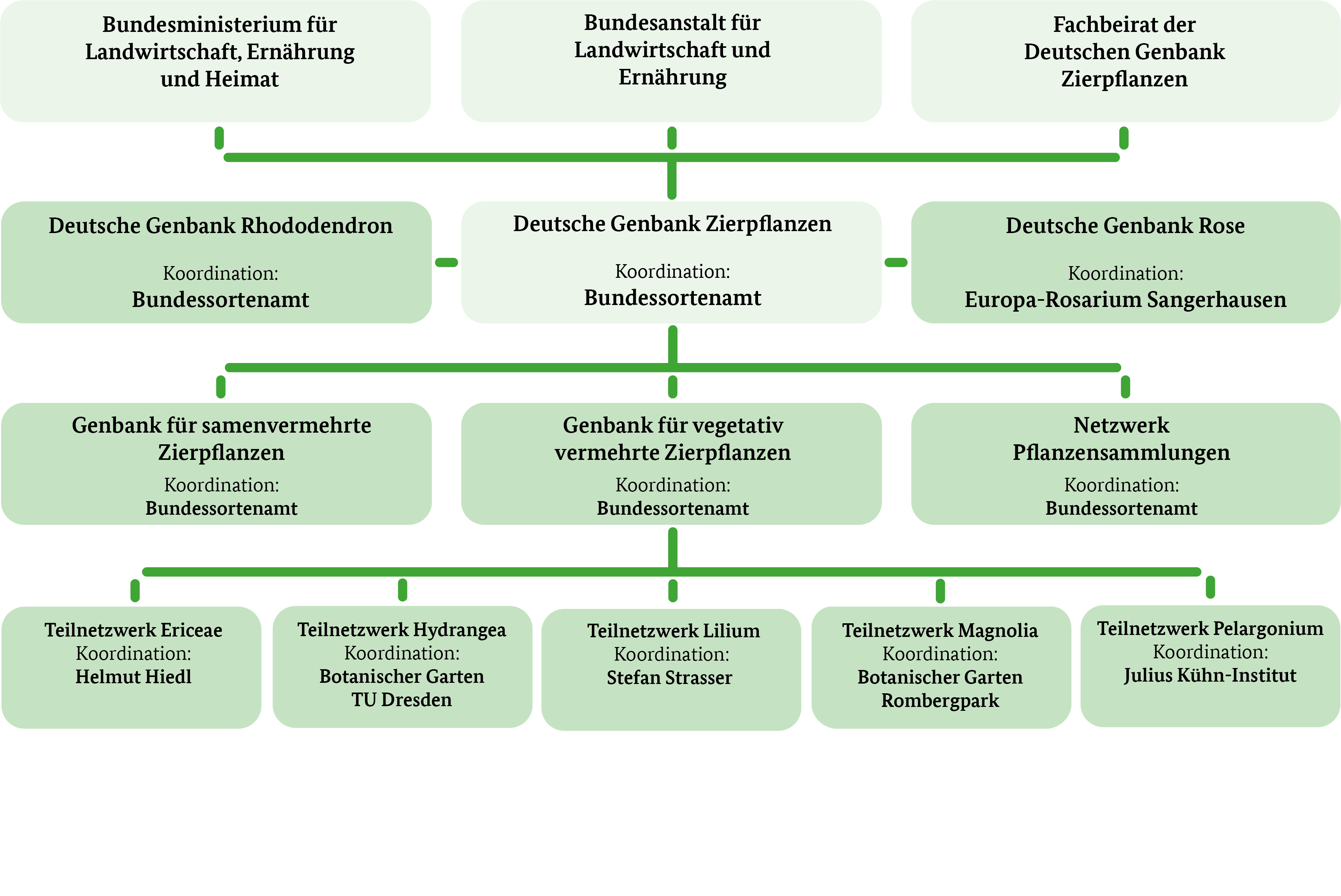 Jede Genbank besteht aus einer Koordinierungsstelle, sammlungshaltenden und unterstützenden Partnerinnen und Partnern, sowie dem BSA und der BLE (Organigramm der DGZ). Die sammlungshaltenden Partner bringen Material in die Genbank ein, unterstützende Partner sind durch ihre Fachkenntnis wichtige Mitwirkende. Alle Genbanken und Teilnetzwerke treten unter dem gemeinsamen Logo der DGZ auf. Die wissenschaftliche Beratung erfolgt durch den Fachbeirat der Deutschen Genbank Zierpflanzen.
